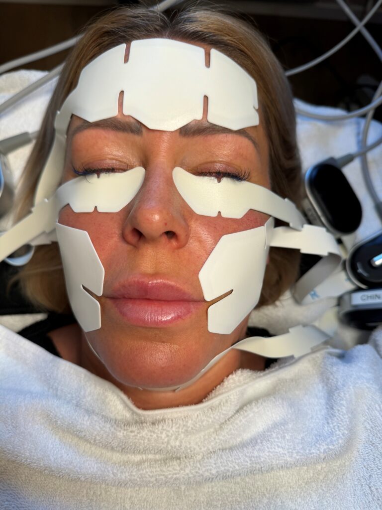 INSCULPT FACE är en icke-invasiv behandling som kombinerar radiofrekvens med muskelstimulering för att förbättra hudens fasthet och ansiktskonturer. Behandlingen värmer upp hudens djupare lager för att stimulera produktionen av kollagen och elastin, vilket kan bidra till en fastare och mer elastisk hud. Samtidigt aktiveras ansiktsmusklerna för att ge tydligare konturer, till exempel längs käklinjen.